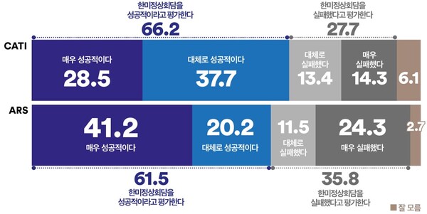 같은 시기에 진행한 ARS조사에서도 ‘성공적’ 61.5%, ‘실패했다’ 35.8%로, 격차는 25.7%p였다.