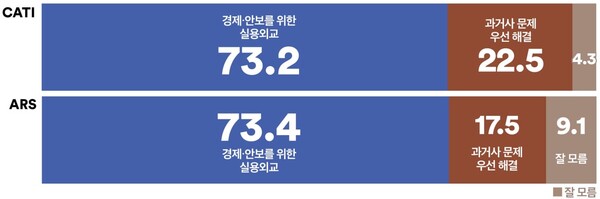 같은 시기에 진행한 ARS 조사에서도 ‘실용외교’ 73.4%, ‘과거사 문제 우선 해결’는 응답이 17.5%로 집계돼, 두 응답 간 격차는 55.9%p에 달했다.