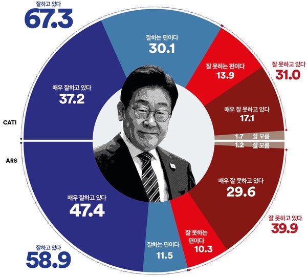 이재명 대통령의 국정운영 평가는 전화면접조사 기준 ‘긍정’평가 67.3%, ‘부정’평가 31.0%로 집계됐다. 1주전 조사보다 긍정은 3.1%p 오르고, 부정은 3.3%p 내렸다.