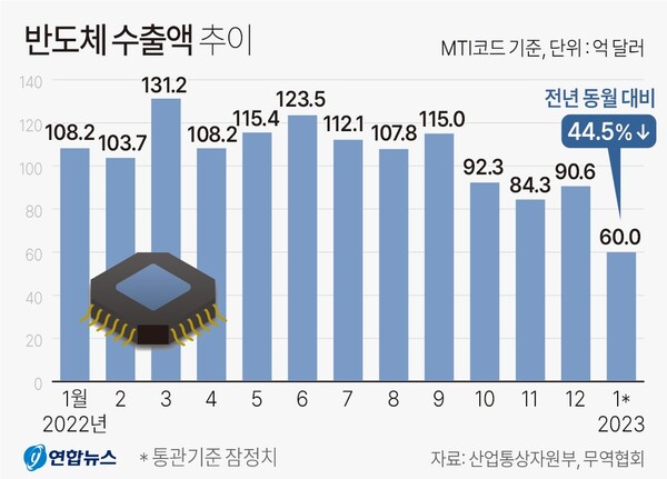 정부는 1월 반도체 수출이 큰 폭 감소한 것은 지난해 1월 실적이 월간 기준으로 역대 최고를 기록한 데 따른 기저효과 때문으로 설명하고 있다. 추경호 부총리 겸 기획재정부 장관은 이날 서울 양재동 aT센터에서 재정경제금융관 간담회를 열고 “반도체 실적 악화는 계절적 요인과 중국 경제활동 차질 등이 크게 작용했다”면서 “1월이 지나면서 점차 개선될 것”이라고 내다봤다.