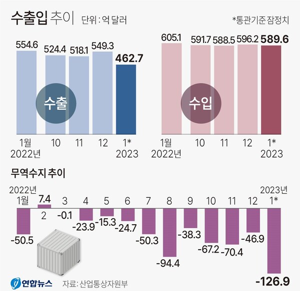 이에 따라 우리나라 무역수지는 마이너스 126억 9000만달러(15조 6000억원)로 월간 역대 최대 규모 적자를 기록했다. 월간 기준으로 종전 적자 최대치인 작년 8월(94억 3000만 달러) 기록을 훌쩍 뛰어넘은 수치다.
