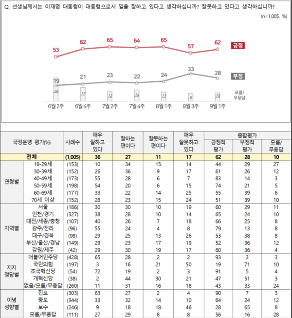 [전국지표조사] 국정운영 긍정 62%, 부정 28%