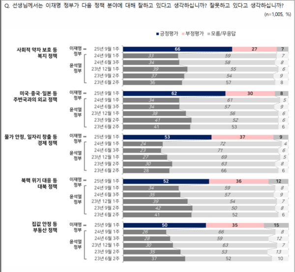 주요 정책 과제 긍정 평가 비율: 복지> 외교> 경제> 대북> 부동산 정책 순