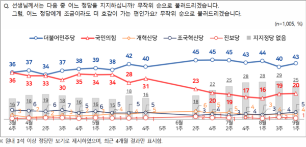 정당지지도는 더불어민주당 43%, 국민의힘 20%, 조국혁신당 5%, 개혁신당 4%, 진보당 1% 등의 순으로 나타났다(‘태도유보’(없다+모름/무응답 25%). 2주 전에 비해 더불어민주당은 3%p 올랐고 국민의힘은 1%p 올라 20%를 회복했다.