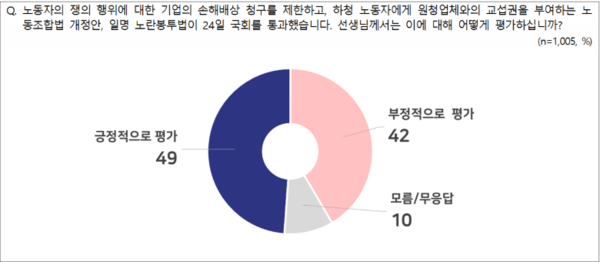 노란봉투법 국회 통과 평가: 긍정 49% 대 부정 42%
