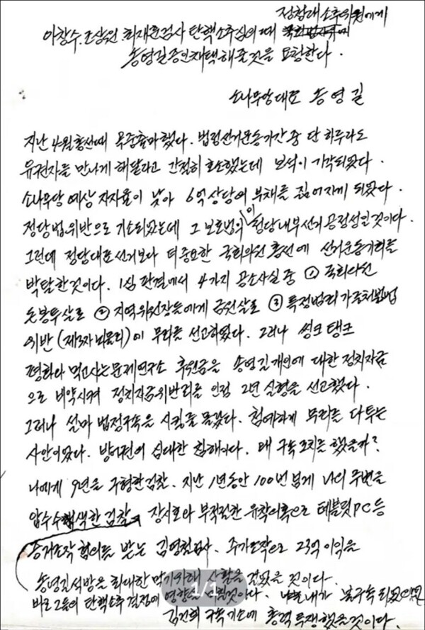 최재훈 검사의 최후 진술을 보면서 정말 피가 끓었습니다. 아무 기회를 못 가진 게 지금도 못내 아쉽습니다. '송영길 TV'에서도 얘기했고 제 변호인인 이광범 변호사를 통해서 요청을 하고 편지도 전달했는데 아무런 답이 없습니다. 제가 알지 못하는 법사위원장으로서 무슨 사정이 있다면 납득할 수 있게 밝혀줬으면 좋겠습니다."