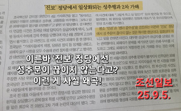 <조선일보>는 지난 총선에서 조국혁신당이 돌풍을 일으키자 조국당은 전과자, 피의자, 피고인이 모인 ‘범죄자 정당’이고 국회를 범죄 도피처로 삼으려 한다고 악담을 해댔다. 그토록 조국혁신당과 조국을 미워하는 <조선일보>이지만 언론이라는 간판을 달고 있으니 조국혁신당을 비판할 수는 있다. 그런데 왜 진보 정당에선 성 비위 사건이 일상적으로 발생하는 것처럼 과장하고 왜곡하여 진보 정당 전체를 싸잡아 부도덕한 집단으로 매도하는가? 진보 정당에 비해 보수 정당은 도덕적이라 성 비위 사건이 없는가?