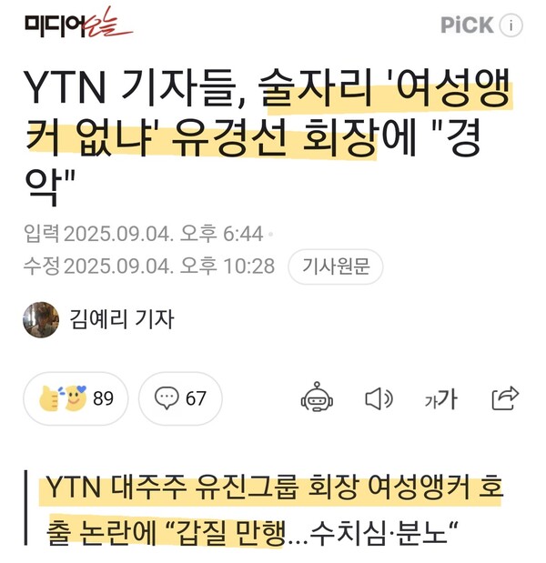 <조선일보>가 사실을 과장하고 왜곡하여 ‘진보’ 정당에선 성추행과 2차 가해가 일상화되고 있다는 악담을 사설로 게재하기 하루 전인 9월 4일, <미디어오늘>에는 YTN을 인수한 유진그룹의 유경선 회장이 여성 앵커를 술자리에 부르게 했다는 기사가 실렸다. YTN의 오너가 된 유 회장은 지난해 12월 YTN의 주요 보직자들을 집합시킨 송년회에서 술을 마시다 “야! 여자 앵커는 없냐”라고 했고 그러자 김백 당시 사장이 보도국장을 다그치고, 보도국장은 부랴부랴 여성 앵커를 술자리에 불렀다는 거다.