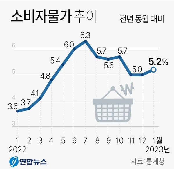 2일 통계청이 발표한 '2023년 1월 소비자물가동향'에 따르면 지난달 소비자물가지수는 110.11(2020년=100)로 작년 같은 달보다 5.2% 올랐다. 전달 상승률(5.0%)보다 0.2%포인트 높아져 작년 9월 5.6%에서 10월 5.7%로 오른 이후 3개월 만에 상승 폭이 커졌다.