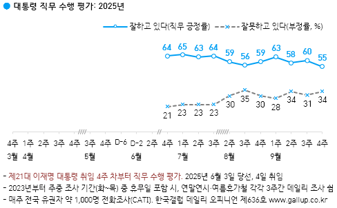 이재명 대통령이 현재 대통령으로서의 직무를 잘 수행하고 있다고 보는지 물은 결과(2점 척도, 재질문 1회), 55%가 긍정 평가했고 34%는 부정 평가했다. 11%는 의견을 유보했다. 긍정 평가는 지난주 조사보다 5%p 떨어진 것이다. 갤럽은 “이번 주 부정 평가 이유 면면으로 미루어 짐작건대 조희대 대법원장 사퇴 압박과 진실 공방, 내란 재판부 변경 등 여당 주도 사안들이 대통령 평가에도 반영된 듯하다”고 분석했다. 앞서 대통령 긍정률 낙폭이 비교적 컸던 시기는 광복절 특별사면 명단 발표 후인 8월 중순, 미국 조지아주 공장 한국인 구금 사태 발생 초기인 9월 초다.