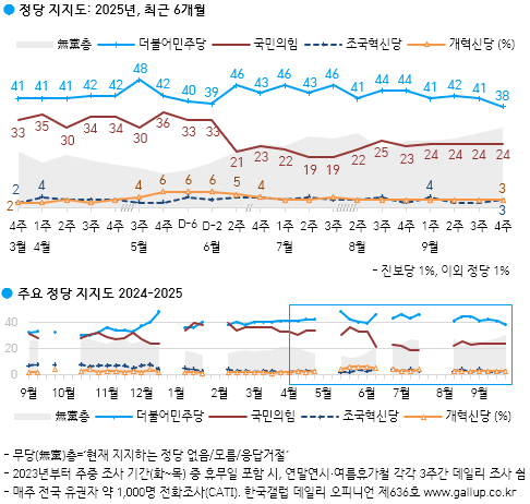 현재 지지하는 정당은(당명 로테이션, 재질문 1회) 더불어민주당 38%, 국민의힘 24%, 조국혁신당, 개혁신당 각각 3%, 진보당 1%, 이외 정당/단체 1%, 지지하는 정당 없음(무당층) 30%다. 민주당 지지도는 8월 셋째 주 44%에서 이번에 38%가 됐고, 같은 기간 국민의힘은 평균 24%로 거의 변함없으며, 무당층 크기는 22%에서 30%로 늘었다.