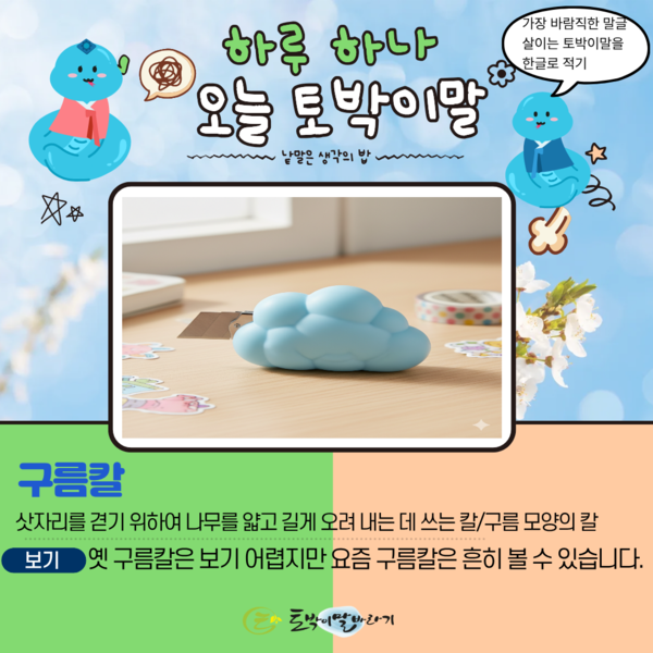 이대로 쓰임새를 잃고 사라지는가 싶었던 이 예쁜 이름이, 오늘날 아주 새로운 모습으로 우리 곁에 되살아났습니다. 요즘 나날쓸몬(생활용품) 가게에 가면 '구름칼'이라는 이름의 몬(물건)을 흔하게 볼 수 있습니다. 다름 아닌 손잡이가 '구름 모양'인 작은 칼입니다. 주로 종이를 자르거나 꾸밈 놀이를 할 때 쓰는 이 '구름칼'은 그 귀여운 모양새 덕분에 많은 사람들이 찾고 있습니다. 옛 구름칼은 보기 어렵지만 요즘 구름칼은 흔히 볼 수 있습니다.