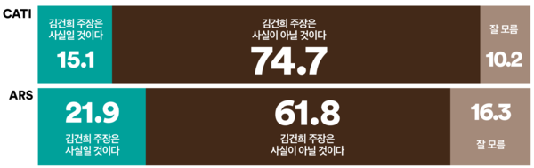 같은 시기에 진행한 ARS조사에서도 비슷한 결과가 나타났다. ‘사실이 아닐 것’이란 응답은 61.8%로, ‘사실일 것’(21.9%)보다 크게 앞서며 39.9%p의 격차를 보였다.