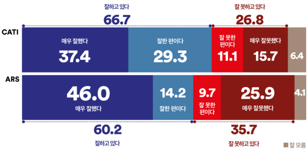 같은 시기에 진행한 ARS조사 결과 역시 비슷했다. ‘잘했다’는 평가는 60.2%로, ‘매우 잘했다’는 응답 역시 절반에 육박했다. 반면 ‘잘 못했다’는 응답은 35.7%로 두 응답간 격차는 24.5%p에 달했다.