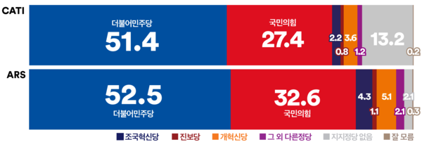 같은 기간 진행된 ARS조사에서도 더불어민주당이 52.5%(5.2%p↓), 국민의힘은 32.6%(1.4%p↑)로 집계됐다. 양당 간 격차는 19.9%p로 나타났다. 더불어민주당은 부·울·경을 제외한 모든 권역에서 하락세를 보였으나, 대구·경북과 강원·제주를 제외한 나머지 지역에서는 여전히 우세를 유지했다. 연령별로는 더불어민주당이 30대 이상 모든 연령대에서 앞서거나 우세했으며, 특히 30~60대 모두 과반의 지지율을 기록했다. 반면 18~29세는 더불어민주당이 12.9%p 하락하고 국민의힘이 5.1%p 상승하며 국민의힘이 우위를 회복했다.