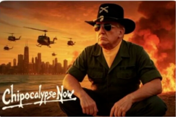 지난달 초, 트럼프 대통령은 자신의 소셜 미디어에 흔히 ‘밈(meme)’이라고 부르는 이미지 파일을 하나 올린다(사진 2). 베트남 전쟁을 배경으로 한 영화 ‘지옥의 묵시록(Apocalypse Now)’(F. 코폴라 감독) 이미지를 차용, 자신을 전투 지휘관으로 묘사한 것이다. 거기에 ‘시카고 묵시록(Chipocalypse Now)’이라는 캡션을 달았고, “시카고는 왜 우리가 국방부를 전쟁부로 이름을 바꿨는지 곧 알게 될 것”이라고 썼다. 대통령의 메시지라고는 도저히 믿을 수 없는 선정적 폭력의 이미지다. 내용으로 보면 그는 이미 시카고에서 어떤 일이 벌어질지 알고 있었던 모양새다.