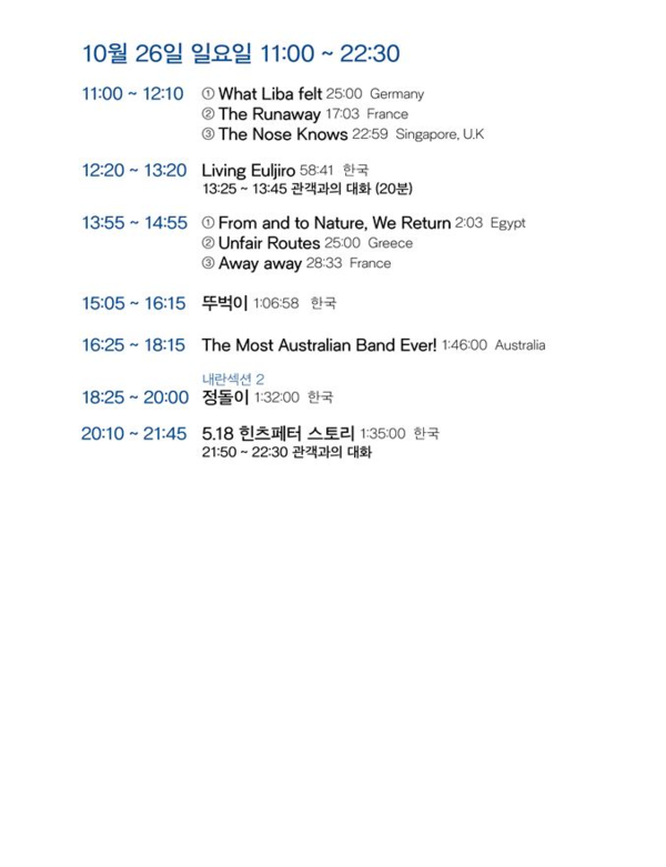 다음날인 26일(일)에는 전두환 쿠데타 정권 시기인 1987년 홀연히 나타난 가출소년이 고려대 운동권 학생들과 군사정권에 맞서 싸우게 된 이야기를 담은 ‘정돌이’(김대현 감독), 80년 광주의 참상을 전 세계에 알린 위르겐 힌츠페터 기자의 지금까지 한번도 알려지지 않은 5월 광주항쟁의 모습을 담은 다큐 ‘5.18 힌츠페터 스토리’(장영주 감독)가 상영됩니다.