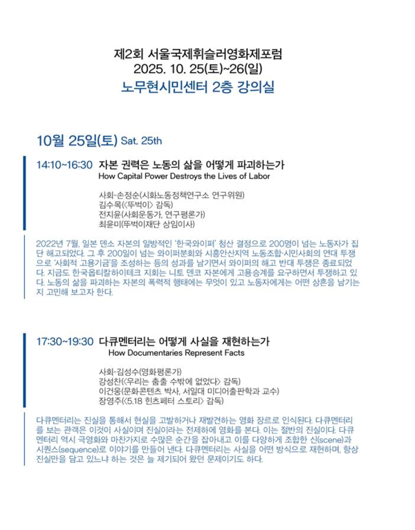 <시민언론민들레>와 <서울국제휘슬러영화제>가 공동주최하는 2025 서울국제휘슬러영화제가 오는 10월 24일(금)부터 26일(일)까지 사흘간 서울 종로구 원서동 노무현시민센터에서 열립니다.