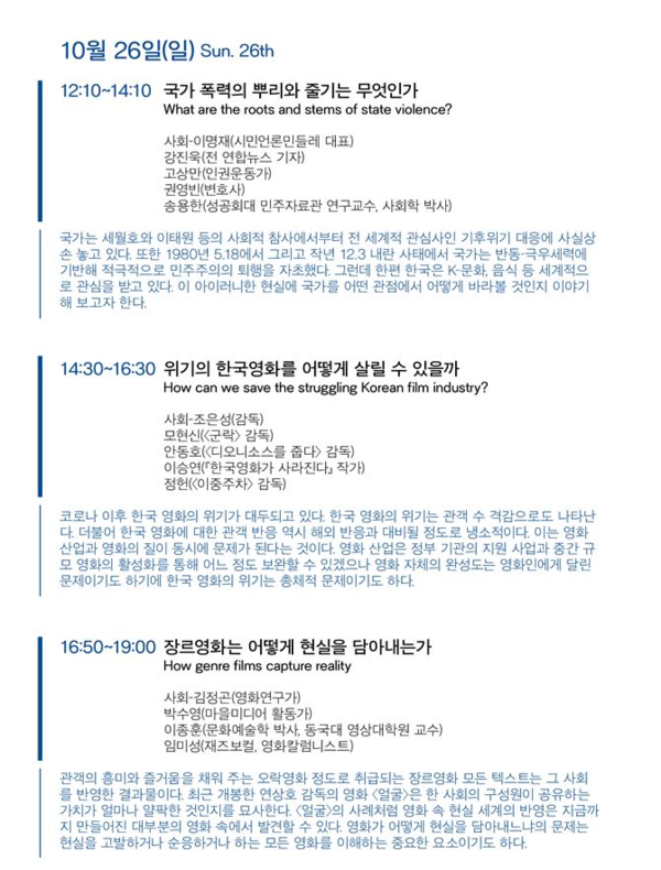 영화 상영 기간 동안 영화와 관련된 주제로 포럼도 열립니다. ▲국가 폭력의 뿌리 ▲자본 권력과 노동의 삶 ▲다큐멘터리와 영화의 현실 재현 방식 ▲한국영화 위기의 해법 등을 주제로 전문가들이 시민과 함께 열띤 토론을 벌일 예정입니다. 포럼은 노무현시민센터 2층 세미나실에서 열립니다(포럼 일정 아래 표 참고).