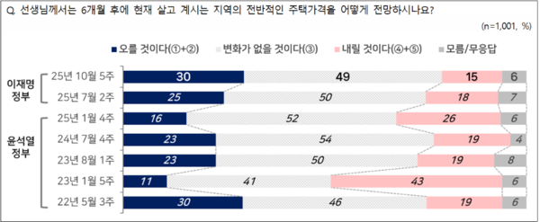 엠브레인퍼블릭·케이스탯리서치·코리아리서치·한국리서치 4개사가 10월 27~29일(3일간) 전국 만 18세 이상 남녀 1001명(응답자 이념성향: 진보 279명, 중도 317명, 보수 295명) 대상으로 휴대전화 가상번호(100%)를 이용한 전화면접 방식의 전국지표조사(NBS·표본오차: 95% 신뢰수준에서 ± 3.1%p)에서, 6개월 후 현재 거주 지역의 전반적인 주택가격에 대해 ‘변화가 없을 것이다’는 전망이 49%로 나타난 가운데, ‘오를 것이다’는 전망이 30%, ‘내릴 것이다’는 전망이 15%였다.