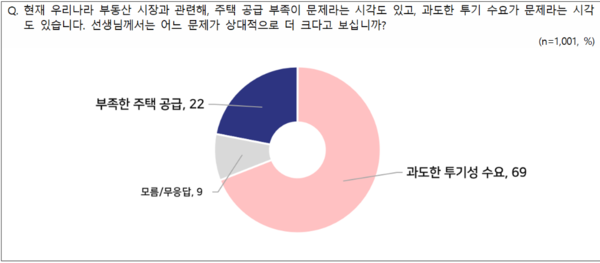 현재 우리나라 부동산 시장과 관련해, ‘과도한 투기성 수요의 문제가 상대적으로 더 크다’는 응답이 69%, ‘주택 공급 부족의 문제가 상대적으로 더 크다’는 응답이 22%였다.