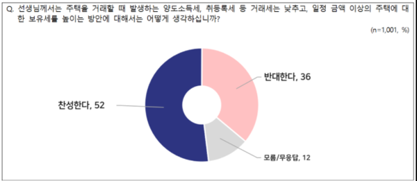 주택을 거래할 때 발생하는 양도소득세, 취등록세 등 거래세는 낮추고 일정 금액 이상의 주택에 대한 보유세를 높이는 방안에 대해서는 ‘찬성한다’는 긍정적인 반응이 52%, ‘반대한다’는 부정적인 반응이 36%였다.