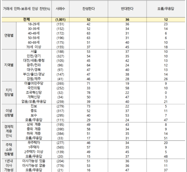 거래세 인하-보유세 인상’: 찬성한다 52%, 반대한다 36%