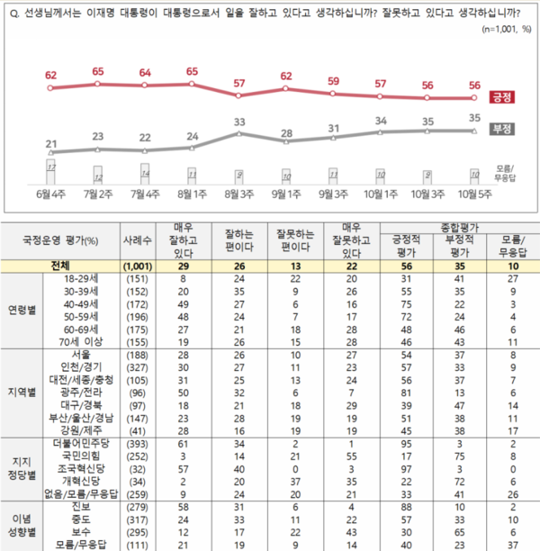 대통령 국정운영 평가는 횡보 ‘긍정’ 56%, ‘부정’ 35%