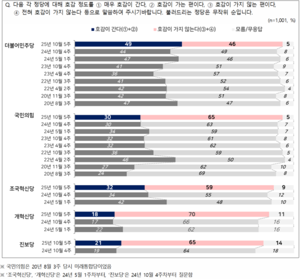 정당호감도: 민주당 49%, 국민의힘 30%, 조국혁신당 32%