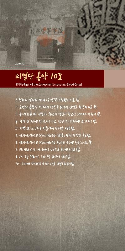창립단원 가운데는 신흥무관학교 출신들이 많았는데요. 피를 나눈 형제처럼 굳은 의리로 뭉치고자 했고, 서로 의형제를 맺고 김원봉을 맏형이라는 뜻의 '의백(義伯)'으로 정했습니다. 그들은 대한민국 임시정부가 파리강화회의에 대표를 파견하는 것이 무의미하다고 생각하며, 무력항쟁 위주의 독립운동 방법론을 모색하고 있었어요.