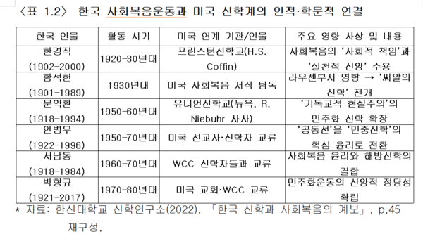 사회복음운동은 1930년대 이후 전 세계로 확산되었고, 한국 개신교도 그 흐름 속에 있었습니다. 1920~30년대 교회는 민족해방과 사회개혁의 윤리적 기반이 되었으며, 이승훈과 주기철 같은 인물들은 신앙을 민족운동의 양심으로 삼았습니다. 해방 이후 미국 유학과 선교 교류를 통해 사회복음 신학이 본격적으로 유입되었고, 라인홀드 니버(Reinhold Niebuhr)의 기독교적 현실주의, 하비 콕스(Harvey Cox)의 『세속도시(The Secular City)』는 한국 신학계에 커다란 영향을 미쳤습니다(니버, 1932; 콕스, 1965/1971). 이러한 사상은 1970~80년대 민중신학(Minjung Theology)으로 발전하며, 기독교의 정의를 시민적 해방의 윤리로 확장했습니다(안병무, 1982).
