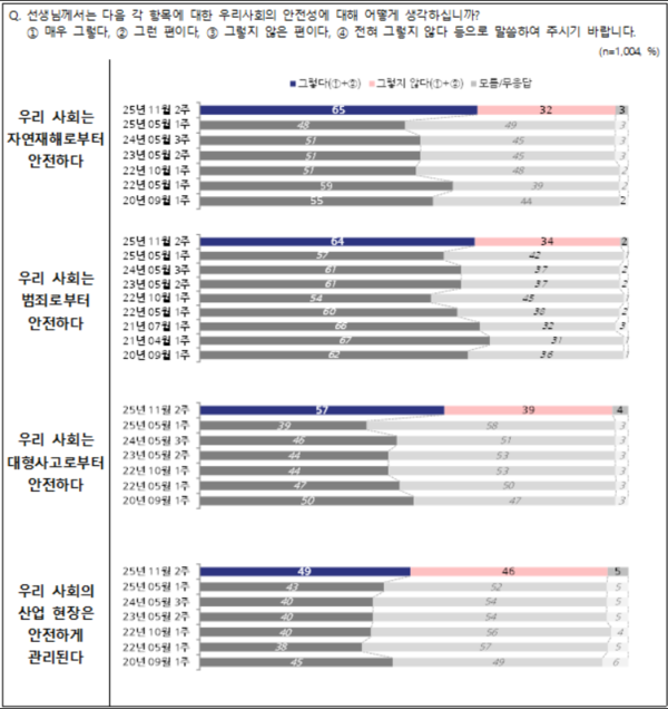 전반적으로 25년 5월 조사 대비 ‘안전하다’는 인식이 높아진 가운데 ‘자연재해’와 ‘대형사고’에서 ‘안전하다’는 응답 비율의 변화 폭이 컸다.(자연재해 48%→65%, 대형사고 39%→57%)
