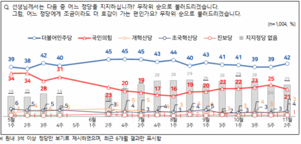 정당지지도는 ‘더불어민주당’ 42%, ‘국민의힘’ 21%, ‘조국혁신당’ 4%, ‘개혁신당’ 3%, ‘진보당’ 1% 등의 순으로 나타났다(‘태도유보’(없다+모름/무응답) 27%). 지난 조사 대비 더불어민주당과 국민의힘 지지도 격차가 벌어진 양상(145p→21%p)을 보였다.