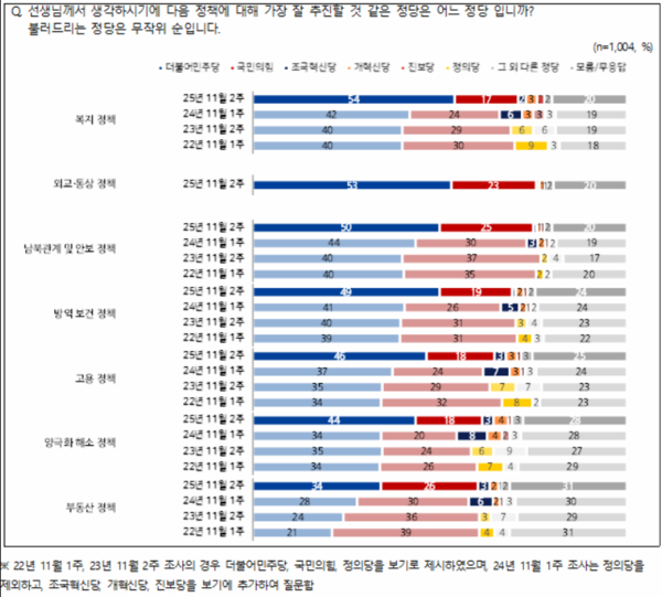 복지 정책에서 국힘당과 격차 가장 크고, 부동산 정책 가장 작음