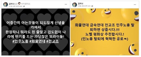 “화물연대 금속연대 전교조 민주노총 탈퇴하면 상 줍시다! 노벨 평화상 추천합시다!(민노총 탈퇴에 혁혁한 공로ㅋ)” “어중간히 아는 것들이 되도 않게 신념을 가져서 완장 차니 뭐라도 된 줄 알고 반기를 드는 가당찮은 또라이들!” “내가 진짜! 민주노총 안 미우면 사람이 아니다. 만만한게 국민이지! 결국에는 국민을 볼모로 레전드 땡깡작전을 시전하는 쌩양아치 집단! 사회악의 축! 암적인 존재들!”