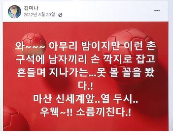 김 의원의 막말은 마침내 성 소수자에로 향한다. “와~ 아무리 밤이지만 이런 춘구석에 남자끼리 손깍지로 잡고 흔들며 지나가는 못볼 꼴을 봤다! 마산 신세계 앞... 열두시...우웩~ 소름끼친다!”