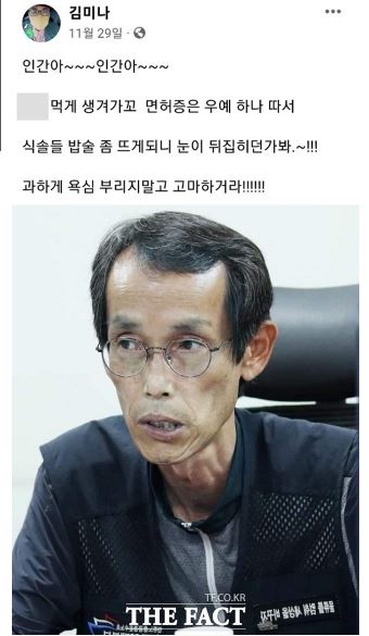 지난해 11월 29일에는 더팩트의 이봉주 화물연대 위원장의 사진과 함께 “인간아, 인간아, XX먹게 생겨가꼬 면허증은 우예 하나 따서 식솔들 밥술 좀 뜨게되니 눈이 뒤집히던가봐”라는 글을 올리기도 했다.