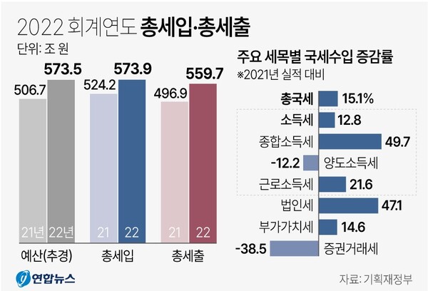 11일 기획재정부가 발표한 '2022회계연도 총세입·총세출 마감 결과'를 보면 지난해 국세수입과 세외수입을 합한 총세입은 573.9조원으로 집계됐다.
