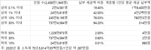 세금의 격차는 소득 불평등의 산물이다. 상위 0.1%가 전체 소득의 4.5%, 1%가 11.7%, 10%가 37.0%를 차지하고 있다. 상위 20% 소득을 하위 20%로 나눈 5분위 배율은 25.3배에 달한다. 이러한 소득 불평등은 (표 1에 정리한) 각 소득 계층이 내는 세금 규모의 차이에서 쉽게 확인된다. 소득이 상위 0.1% 이내에 속하는 2만 4581명이 2020년 소득에 대해 납부한 세금은 전체 세금의 19.4%인 13조 7000억 원이고, 이 집단의 1인당 평균 납부 세금은 1억 9400만 원이었다. 상위 1% 이내에 속하는 24만 5819명이 납부한 세금은 전체 세금의 42.0%인 29조 7000억 원이었고, 상위 10% 이내에 속하는 약 246만 명이 납부한 세금은 전체 세금의 78%인 55조 원이 넘었으며, 상위 30% 이내에 속하는 약 737만 명이 납부한 세금은 전체 세금의 94.2%인 66조 7000억 원이 넘었다. 반면, 하위 50%에 속하는 소득 계층(1229만 명)이 납부한 세금 액수는 전체의 2% 규모인 1조 4000억 원이 채 되지 않았다. 이처럼 대부분 세금은 상위 30%, 특히 상위 10%가 부담을 지고 있다.