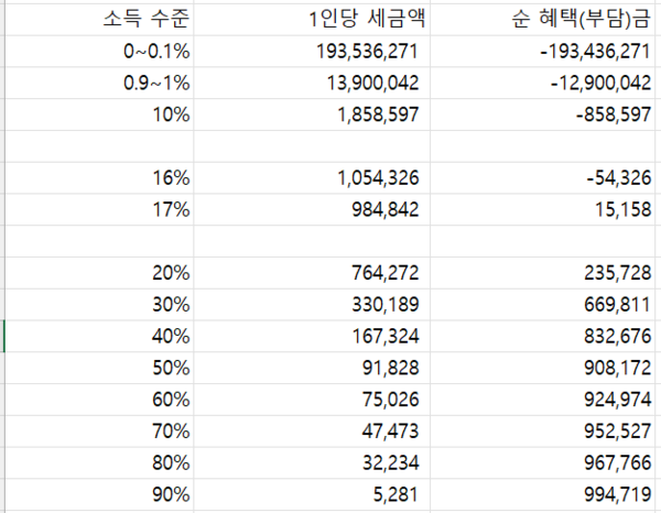 이제 재정으로 난방비 지원 시 소득 계층별 혜택과 손실 효과를 살펴보자. 세금을 내는 2458만 명 모두에게 1인당 난방비로 100만 원씩 지원하고, 이 지원금을 세금으로 충당한다고 가정하자. 이를 정리한 것이 <표 2>다. 상위 0.1% 이내에 속하는 국민 2만 4581명은 세금을 1인당 평균 1억 9400만 원을 내고 100만 원을 지원받기에 순 부담액이 약 1억 9300만 원이 된다. 상위 1%로 확대할 때 이 집단의 1인당 평균 세금은 약 1390만 원이 되기에 지원금 100만 원을 제외한 1290만 원의 순 부담을 떠안게 된다. 같은 논리로 상위 10% 계층은 859만 원의 순 부담을 떠안는다.