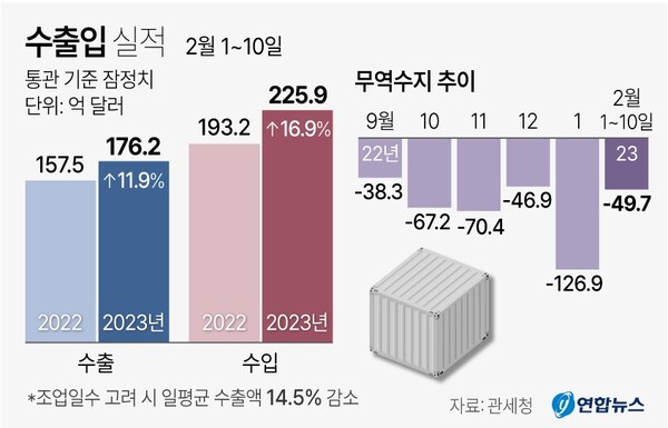 2월 들어 열흘간 무역적자 규모가 50억 달러에 이르고 있어 월간 기준 역대 최대 규모의 적자를 낼 것으로 보인다.
