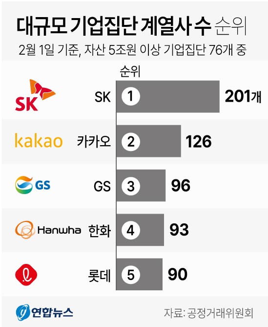 대기업집단 가운데 계열사 수가 많은 순으로는 2위 카카오(126개), 3위 GS(96개), 4위 한화(93개), 5위 롯데(90개) 등으로 조사됐다.