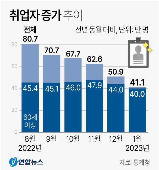 취업자 수는 2021년 3월부터 23개월 연속 증가세를 유지하고 있지만, 지난해 5월 93만 5000명 이후 계속 증가 폭이 작아지고 있다. 작년 12월 50만명에 턱걸이(50만 9000명) 했던 증가 규모가 새해 들어 40만명 대로 더 줄어든 셈이다.