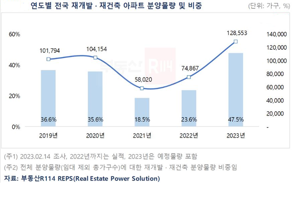 15일 부동산R114에 따르면 올해 분양 예정인 재개발·재건축 아파트는 전국 12만 8553가구에 이를 것으로 집계됐다. 이는 올해 전체 분양계획 물량(임대 제외 총가구 수) 27만 390가구의 47.5%에 해당한다.
