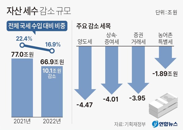 윤석열 정부가 밀어붙이고 있는 부자감세의 영향으로 지난해 자산 관련 세수가 전년보다 10조 원 넘게 급감한 것으로 나타났다. 자산 관련 세수가 전체 국세 수입에서 차지하고 있는 비중이 커져 있어서 올해 세수에도 비상이 걸렸다.