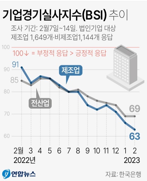 한국은행이 22일 발표한 '2월 기업경기실사지수(BSI)' 조사 결과에 따르면 이달 제조업 업황 BSI는 3개월 연속 하락해 전달보다 3포인트 하락한 63을 기록했다. 2020년 7월(59) 이후 2년 7개월 만에 가장 낮은 수준이다.