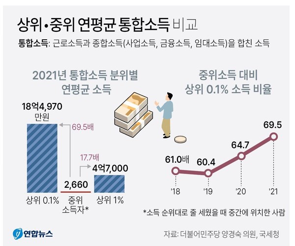 25일 국회 양경숙 의원(기획재정위원회·더불어민주당)이 국세청 자료를 분석한 결과, 지난 2021년 통합소득 상위 0.1%의 연평균 소득은 18억 4970만원이다. 중위소득자의 통합소득 2660만원이었다.