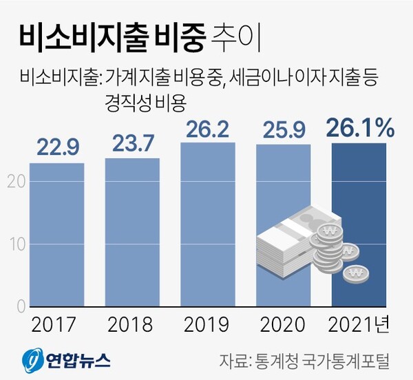 비소비지출 비중은 2017년 22.9%에서 2018년 23.7%, 2019년 26.2%, 2020년 25.9%, 2021년 26.1%로 높아졌다.