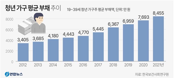 한국보건사회연구원이 이날 내놓은 '청년미래의 삶을 위한 자산 실태 및 대응방안'(곽윤경 외) 보고서에 따르면 지난 2021년 말 기준 19~39세 청년이 가구주인 가구의 평균 부채는 8455만 원이었다. 2012년 3405만 원의 2.5배 가까이 늘어난 수준이다.