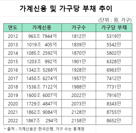 가구당 부채는 2002년 3076만 원에서 2007년(4008만 원) 4000만 원 선을, 다시 2011년(5124만 원) 5000만 원 선을 넘었다. 이어 2015년(6328만 원) 6천만원선을 돌파했고, 2016년 6963만 원, 2017년 7412만 원, 2018년 7731만 원, 2019년 7916만 원, 2020년 8343만 원, 2021년 8755만 원까지 불어났다.